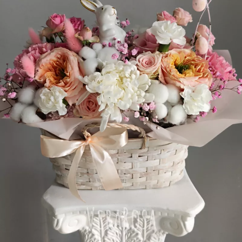 Нежный весенний букет в плетеной корзине, украшенный милым кроликом и пасхальными яйцами, станет прекрасным подарком к празднику. Композиция из роз, хризантем и гипсофилы, дополненная хлопковыми шариками, создаст атмосферу уюта и весеннего настроения.